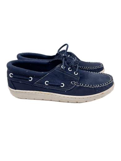 Nello stile boat shoes, sono interamente in pelle blu (con il collo del piede imbottito) e hanno la para in gomma bianca.